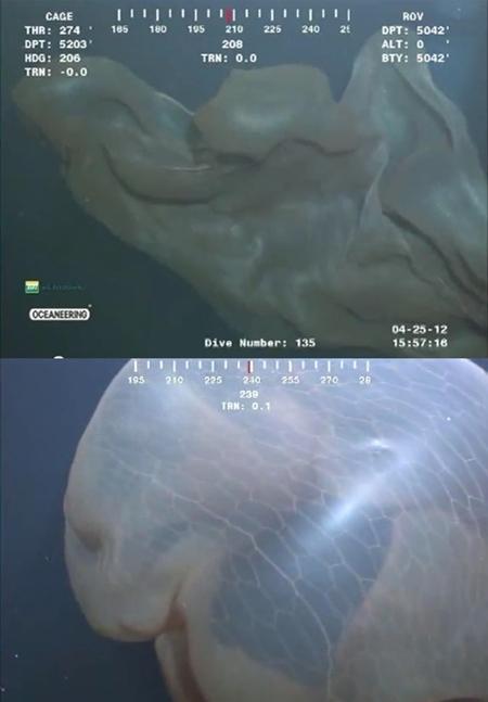 특히 충격적 심해 괴생물은 바다를 마치 ‘펄럭이듯’ 헤엄치고 있는 모습으로 바다에 버려진 담요 혹인 연체동물의 진화 이전의 모습쯤으로 보여 눈길을 끈다.