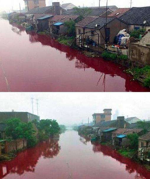 중국의 한 마을에 핏빛 강줄기가 흐르는 모습이 공개돼 충격을 안겼다.