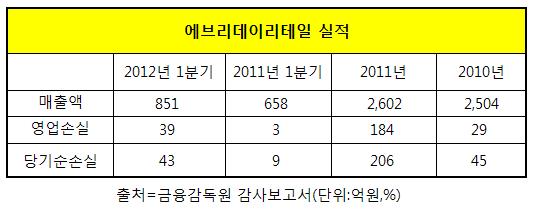 에브리데이리테일이 올 1분기 낸 적자규모는 지난 2010년 한 해 누적 손실을 뛰어 넘는 수준이다.