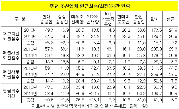 현대중공업, 삼성중공업, 대우조선해양, STX조선해양, 현대삼호중공업, 현대미포조선, 한진중공업 등 주요 조선업체 7곳의 지난해 현금회수기간은 평균 15.5일을 기록했다. 2010년 9.5일에서 6일이나 늘어났다.