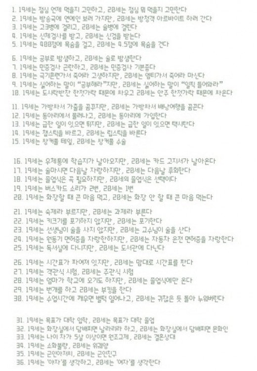 19세와 20세의 차이점을 총 36가지로 나눠 정리한 이 게시물은 1살 차이에도 불구하고 원하고 생각하는 것과 라이프스타일 등이 크게 달라 네티즌의 흥미를 자아내고 있는 것.