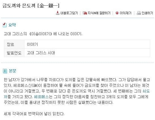 인터넷 백과사전 캡처 사진과 함께 금도끼 은도끼 동화 유래를 간략히 설명한 이 게시물은, 금도끼 은도끼가 그리스 전래동화라고 밝히고 있어 네티즌들에게 충격을 주고 있다.
