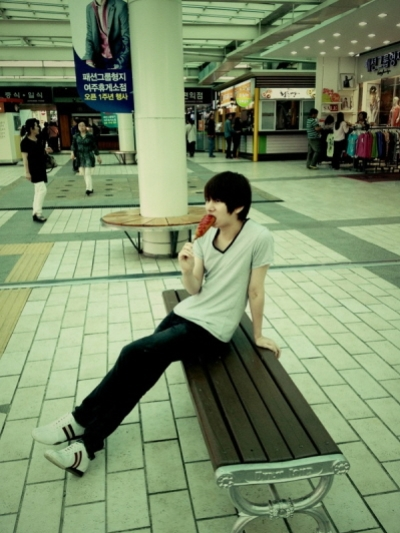 공개된 사진 속 김희철은 청바지와 회색 티셔츠를 입고 휴게소 벤치에 앉아 핫도그를 먹고 있다.