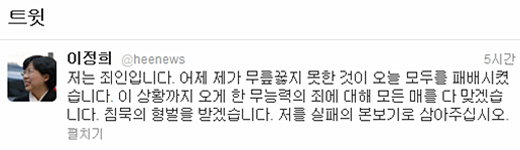 이정희 통합진보당 공동대표가 13일 오전 자신의 트위터(@heenews)를 통해 "침묵의 형벌을 받겠다"고 올려 누리꾼들의 이목을 집중시켰다.