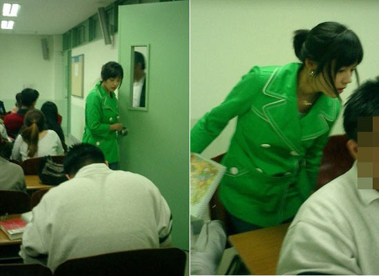 특히 그녀는 수업에 지각한 듯 강의실 문을 조심스럽게 열고 들어와 급하게 자리에 앉고 있는 모습이다.