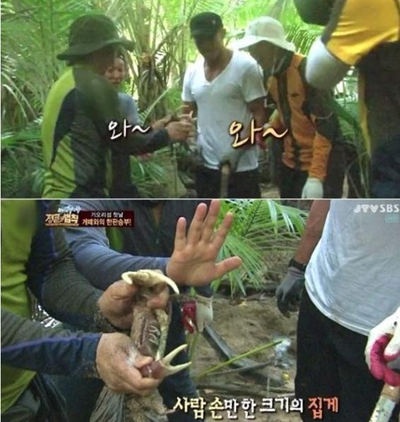 특히 가오리섬의 게들이 도망가지 않고 공격적인 모습을 보이자 김병만은“애네가 잘 안도망가요. 사람을 무서워하지 않아”라며 놀라워했다.