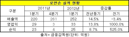 금융감독원 공시자료에 따르면 로만손의 1분기 영업익과 순익은 각각 33억원, 25억원으로 전년동기 대비 13.8%, 8.7% 늘었다. 매출액도 같은 기간 14.5% 증가한 252억원을 기록했다.