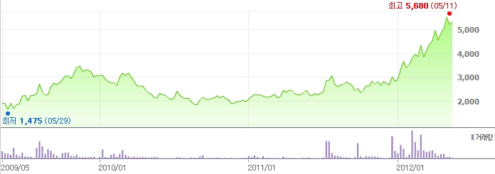 로만손의 실적 상승세와 해외 진출 기대감으로 주가도 뜨는 중이다. 지난 2009년 1천475원이던 주가는 지난 11일 5천680원으로 최고가를 기록했다. 3년 사이 4배 가까이 치솟았다. 15일 주가는 전일 대비 3.1%(170원) 떨어진 5천320원을 기록했다.