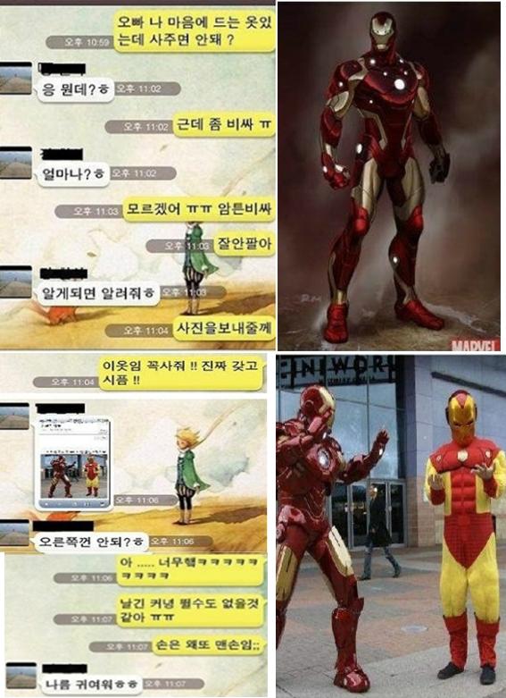 이에 남자친구는 "이 옷은 안되냐"며 다른 사진을 보여준다. 남자친구가 올린 사진에는 아이언맨을 흉내내 만들어진 옷을 입고 있는 우스꽝스런 모습이다.