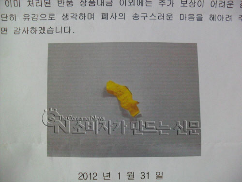 정 씨는 “제조공장에서 조사 결과를 보내왔지만 성분분석 등도 빠져 있어 조사를 진행하긴 했는지 신뢰가 가지 않는다”며 “이제 4살인 둘째 아이도 같이 먹고 있었는데 만약 목에 걸리기라도 했다면 매우 위험한 상황이 될 뻔 했다”고 말했다.