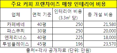 21일 각 커피 프랜차이즈 업체들이 홈페이지 등을 통해 공시한 자료에 따르면 가맹점 개설 비용이 가장 높은 곳은 투썸플레이스로 45평 기준 평균 2억3천570만원이 소요되는 것으로 나타났다. 반면 3.3㎡ 당 인테리어 비용은 196만원으로 가장 낮은 수준에 속했다.
