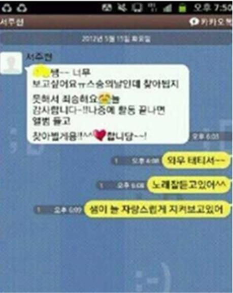 공개된 사진은 서현과 선생님의 휴대폰 문자 메세지 대화 내용을 캡처한 것이다.
