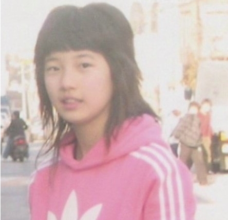 사진 속 수지는 핑크색 후드티에 한때 유행했던 '울프컷' 머리 모양을 하고 서 있다.