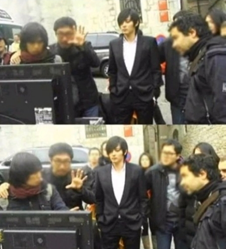장동건은 이 사진에서 주변의 스태프들에 비해 작은 얼굴과 훤칠한 키로 눈길을 사로잡는다.