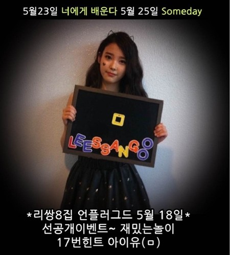 아이유는 사진 속에서 초성 'ㅁ'이 적힌 플랜카드를 들고 깜찍한 표정을 짓고 있다. 리쌍의 초성 게임은 17개의 자음과 모음을 조합해 이번 새 선공개곡 제목을 알아 맞추는 것으로 17일 정오에 정답이 공개된다.