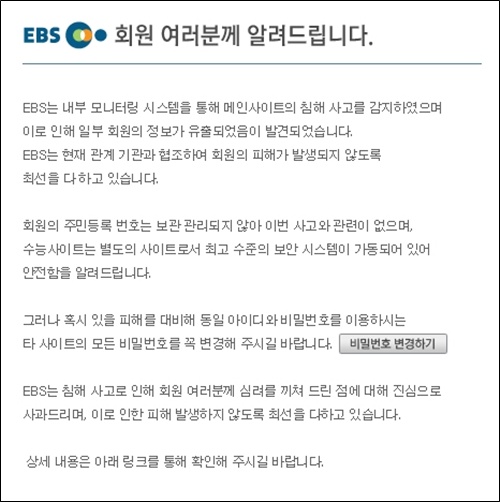 EBS는 개인정보가 유출됐을 가능성이 있는 회원들에게 안내메일을 보내고 같은 아이디와 비밀번호를 쓰는 다른 사이트의 모든 개인정보를 변경하고 보이스피싱이나 스팸메일을 주의하라고 당부했다.
