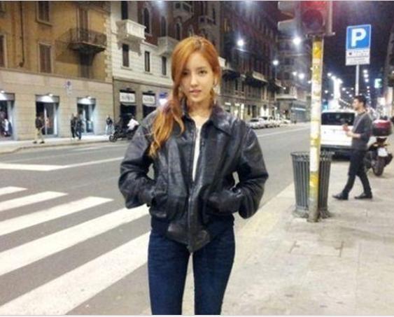 이와 함께 공개한 사진에서 효민은 검정색 가죽 재킷을 입고 거리에 서 있다.