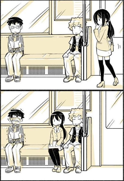 공개된 카툰에는 지하철에 의자에 앉아있는 두 명의 남자와 자리를 놓고 고민하는 여자의 모습이 담겨있다.
