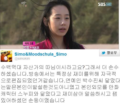 시모는 지난 18일 오후 자신의 트위터에 “수백억대 자산가의 따님이시라고요? 그래서 더 순수하셨습니다. 방송에서는 특정상 재미를 위해 자극적으로 편집되었던거 같습니다. 연예인 박수진씨 닮았다는 말은 본인이 발설한것도 아니였고 본인외모를 만화캐릭터 스누피와 닮았다고 재미삼아 말씀하시고 잼있어 하셨던 순둥이였습니다”는 글을 게재 했다.