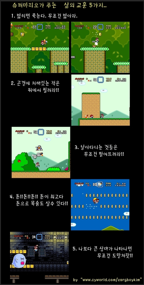 최근 온라인 상에서 화제가 되고 있는 '슈퍼마리오가 주는 교훈'은 인기 게임 슈퍼마리오의 장면들을 캡처해 교훈에 대해 설명해놓았다.