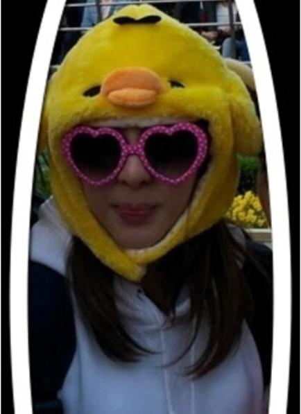 산다라박은 공개된 사진에서 병아리 모양의 모자를 쓰고 하트 모양 선글라스로 귀여운 매력을 선보였다.