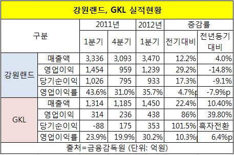 내국인 전용 카지노 강원랜드와 외국인 전용 카지노 GKL(그랜드코리아레저)의 1분기 실적 희비가 엇갈렸다.