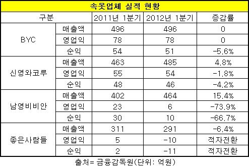 남영비비안은 감소 폭이 가장 컸다. 영업익과 순익은 각각 6억원, 10억원으로 반 토막 이상 줄어들었다. 그러나 매출액은 464억원으로 15.4% 늘었다.