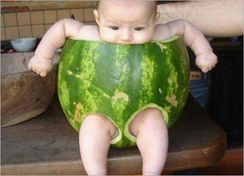 게시물 속 '수박 수영복' 사진에는 한 아기가 수박으로 만든 수영복을 입고 있으며 아기는 수박 껍질 두 개의 구멍을 뚫고 수영복처럼 다리를 끼고 입고 있다.