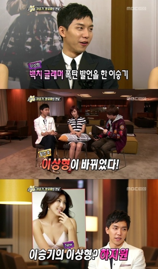 이날 방송에서 이승기는 이상형에 대해 묻는 질문에 "백치 글래머에서 최근 이상형이 바뀌었다"며 "하지원 선배님이 이상형이다. 함께 촬영 하다 보니 너무 매력도 많고 푹 빠졌다"고 언급했다.