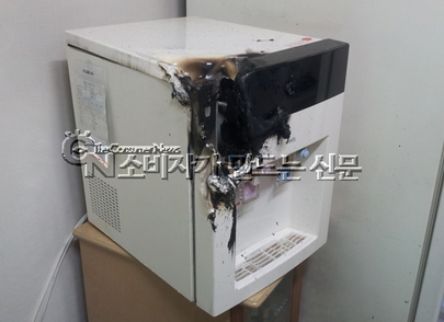 주방 냉장고 옆에 두고 사용하던 정수기에서 갑자기 퍽 소리가 나면서 내부에서 연기와 함께 불꽃이 튀기 시작했다.