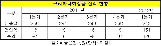 작년 코리아나화장품은 아이기스화진화장품, 참존 등 중견화장품업체들 중 나홀로 실적이 추락하는 쓴 맛을 봤다. 작년 4분기 중 3분기 동안 손실을 기록, 영업익 2억원, 순익 16억원 수준에 그쳤다.
