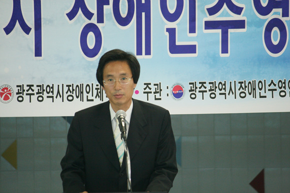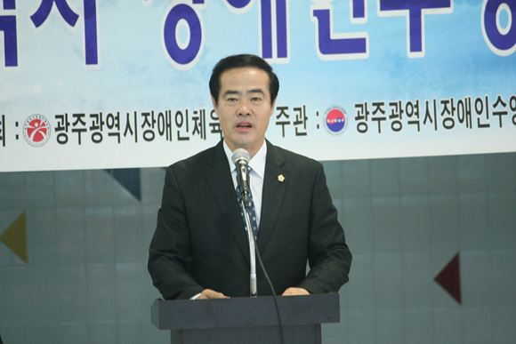 축사에 나선 홍기월 동구의회 의장은 "오월의 밝은 햇살 가득한 일요일 이곳 동구에서 장애인과 비장애인이 어우러져 소통하며 수영대회를 개최한 것에 큰 의미가 있다"며 "광주의 중심인 이곳 동구에서 광주의 정신인 나눔과 화합의 장이 시작된 것을 동구의회 의장으로서 또한 동구민으로서 자부심을 갖는다"고 역설했다.