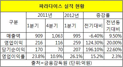 파라다이스그룹의 코스닥상장 계열사인 (주)파라다이스가 외래관광객수 증가에 힘입어 올 1분기 실적에서 상승세를 이어갔다.
