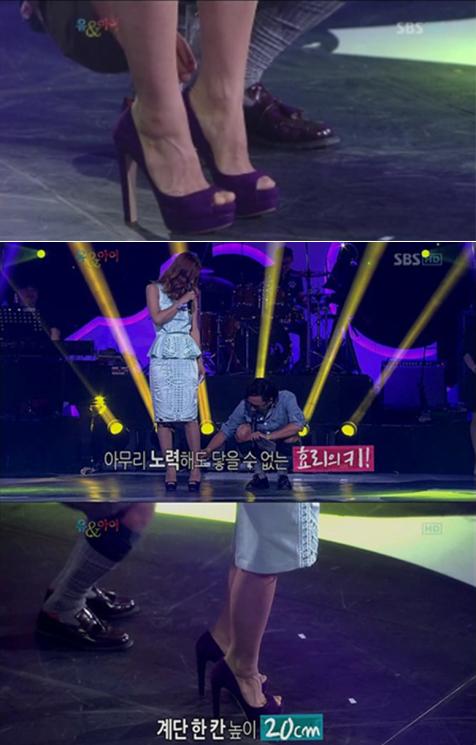 정재형은 이효리의 킬힐 높이를 재더니“이게 20cm다. 계단 하나를 왔다 갔다 하는 높이다"라고 말했다.