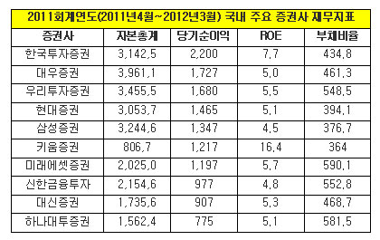 2011회계연도(2011년4월~2012년3월)당기순이익은 한국투자증권(2천200억원)이 업계 1위를 차지한 가운데 현대증권과 삼성증권 등 일부 증권사들은 전년대비 하락했다.