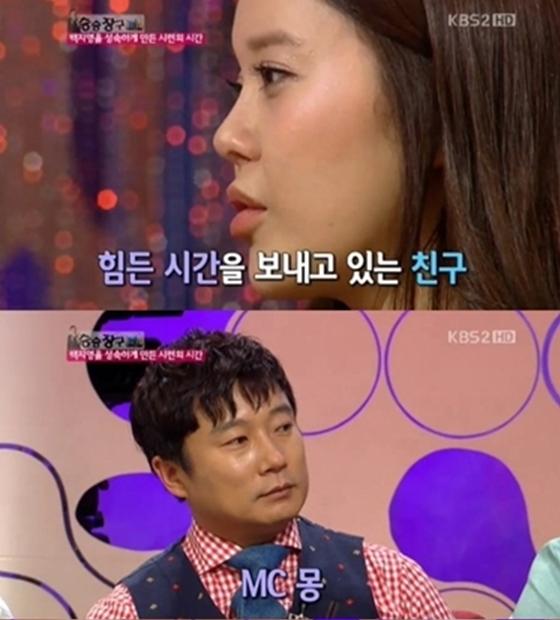 백지영은 22일 KBS 2TV '승승장구'에 출연해 "내 친한 친구가 과거 내가 겪었던 힘든 시간을 견디고 있다"고 전했다.
