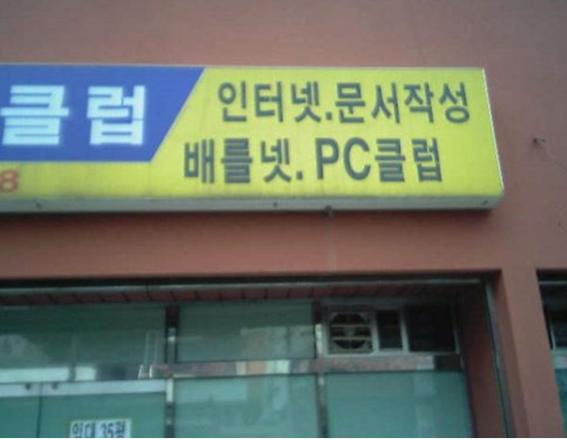 사진에는 피씨방 간판에 '인터넷, 문서작성, 배를넷, PC클럽'이라고 적혀있다.