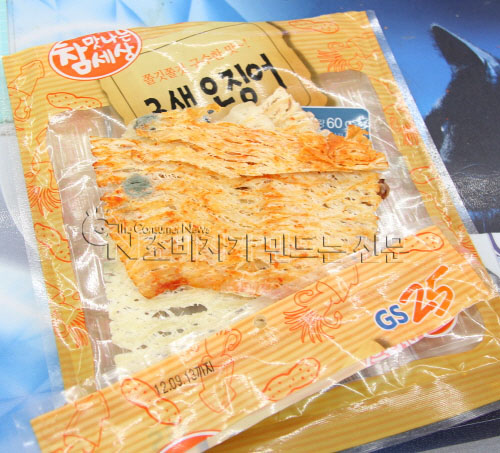 30일 전남 광양시에 사는 박 모(남.33세)씨에 따르면 그는 며칠 전 GS25 편의점 안주류 코너에서 삼색오징어 제품을 6천원에 구매했다.