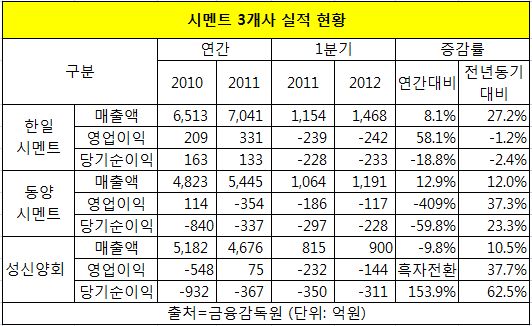 그러나 시멘트 3사 중 최고의 매출을 올린 한일시멘트는 유일하게 영업손실과 당기순손실이 증가했다. 반면, 동양시멘트와 성신양회는 영업손실 폭과 당기순손실 폭을 크게 줄여 선방했다.