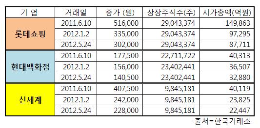 백화점 대장주 롯데쇼핑 주가는 1년 사이 40%나 빠지며 시가총액이 무려 6조원 가까이 증발했다.