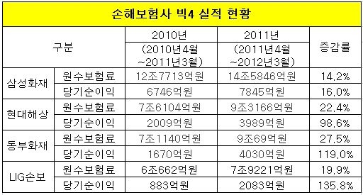 동부화재 당기순이익은 2010년 1천670억원에서 지난해 4천30억원으로 껑충 뛰었다. 현대해상은 3천989억원을 기록했으며, LIG손보도 전년대비 135.8% 늘어난 2천억원을 기록했다.