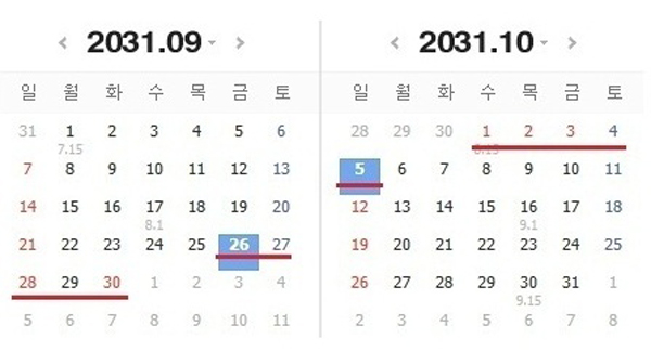 자세히 살펴보면 2031년에 추석은 10월 1일 수요일이다. 이에 9월 30일과 10월2일은 추석 연휴가 되고, 10월 3일은 개천절이다.