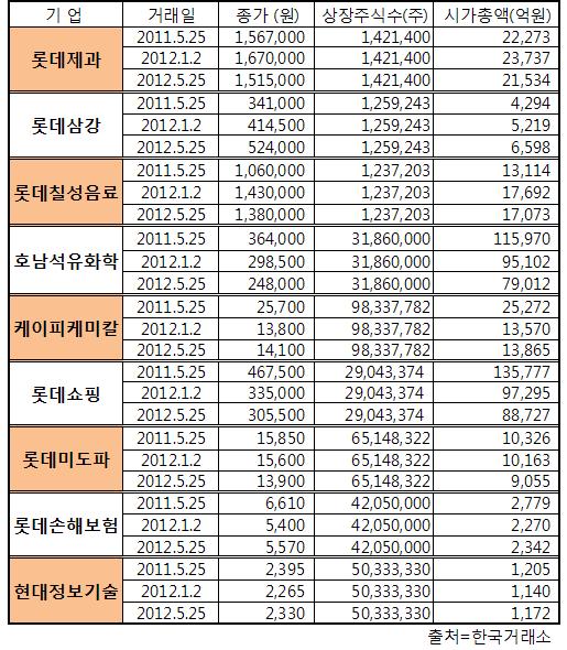 1년 전(2011년 5월 25일 기준) 이 맘 때만 해도 롯데그룹 상장계열사들의 시총규모는 33조원 대를 웃돌았지만 최근 9조원 넘게 증발한 상태다.