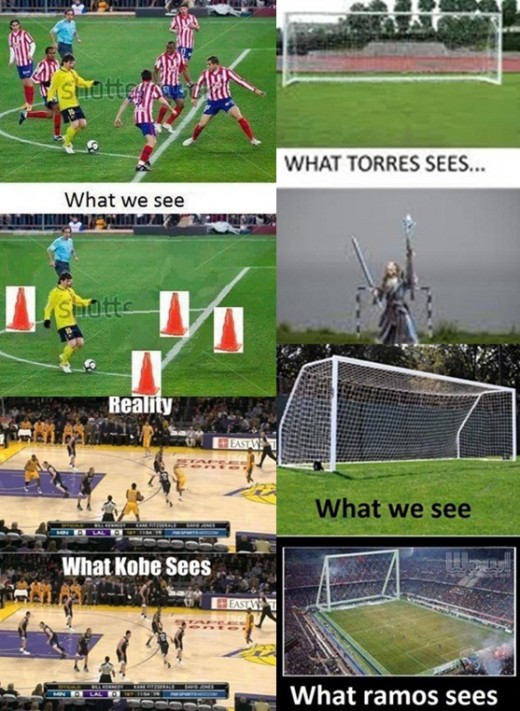 우선 골 폭풍을 몰고 다니는 메시는 자신을 둘러싼 수비수들을 단순 장애물로 보고 있어 웃음을 자아낸다. 요즘 부진한 토레스의 눈에는 축구 골대가 핸드볼 골대처럼 작게 보인다.
