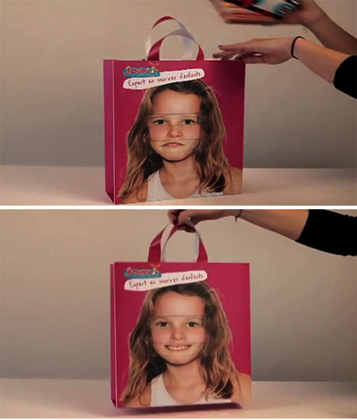 이 쇼핑백은 한 완구회사에서 만든 것으로 특수장치를 이용해 얼굴 표정을 다르게 했다. 장난감이 아이들을 행복하게 한다는 메시지를 담고 있다.
