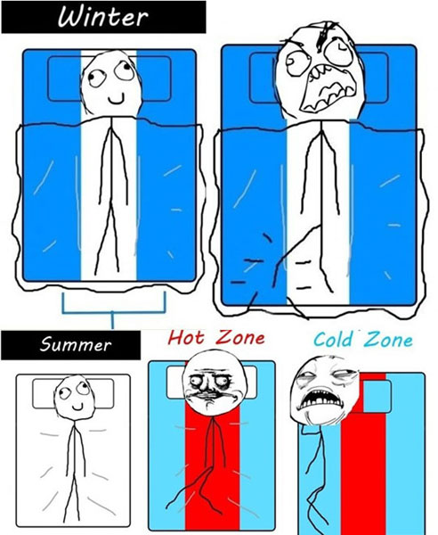 그림에 따르면 겨울에는 침대의 중앙이 가장 따뜻하다. 그러나 정중앙을 조금이라도 벗어나면 살얼음 같은 추위가 엄습한다.
