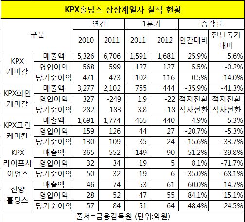 KPX홀딩스그룹의 5개 상장계열사 중 KPX케미칼과 진양홀딩스의 실적은 양호했으나 나머지 3개사(KPX화인케미칼, KPX그린케미칼, KPX라이프사이언스)는 전반적으로 악화돼 희비가 교차됐다.
