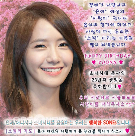 ‘윤아 생일 축하 광고’에는“꽃비가 내립니다. ‘윤아’ 여신의 ‘사랑비’ 입니다. 윤아의 향기에 취하고 사랑에 빠진 우리는 ‘소원’이라는 이름의 팬이 되었습니다. 소녀시대 윤아의 23번째 생일을 축하합니다”라는 문구가 적혀있다.