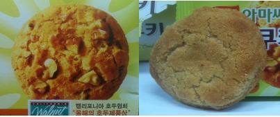 ▲ 청우식품의 '아마씨 호두 쿠키'의 이미지컷(좌)와 실제품. 광고 사진과 달리 호두 토핑을 전혀 찾아볼 수 없다.