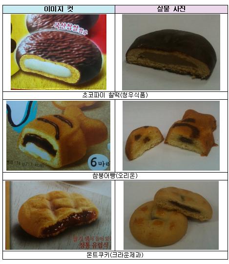 소비자가 제보한 청우식품의 ‘아마씨 호두쿠키’는 타사의 제품과 비교해도 이미지의 과장정도가 가장 심했다. ‘찰떡쿠키’의 내용물 역시 이미지로 표현된 흰 찹쌀떡의 색깔과 식감과는 다소 차이가 있었다.
